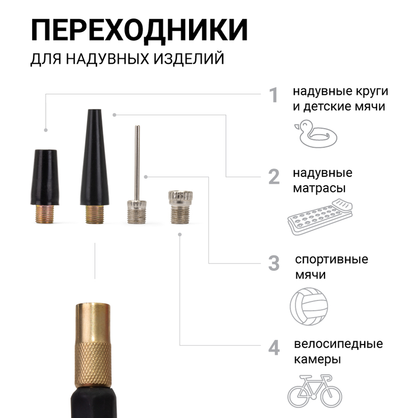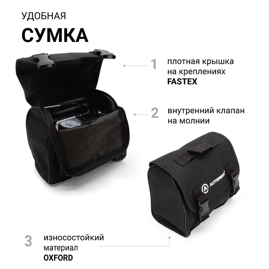 Комплектуется четырьмя переходниками для накачивания воздушных изделий, сумкой и всё это упаковано в красочную фирменную картонную коробку AUTOPROFI.