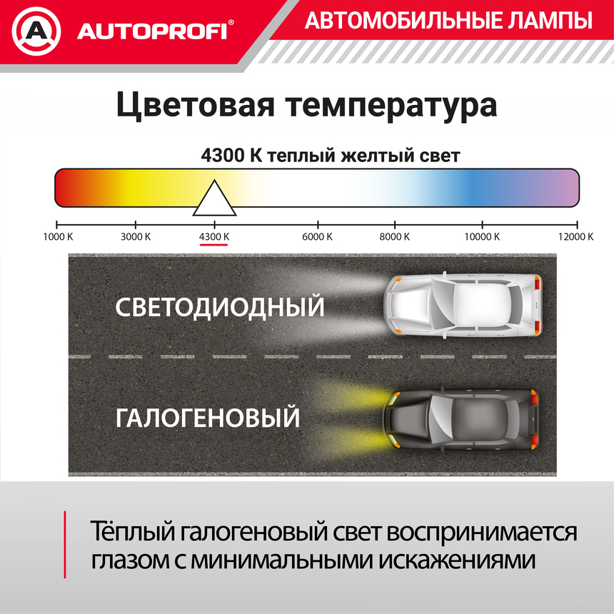 Линейка галогеновых ламп AUTOPROFI PERFORMANCE - лампы с улучшенными техническими характеристиками и световым потоком на 80% мощнее чем у стандартных галогеновых ламп. Расчетный срок службы в трое превышающий обычные лампы. Специальное нанесение на колбу обеспечивает более белый спектр свечения (4300К).