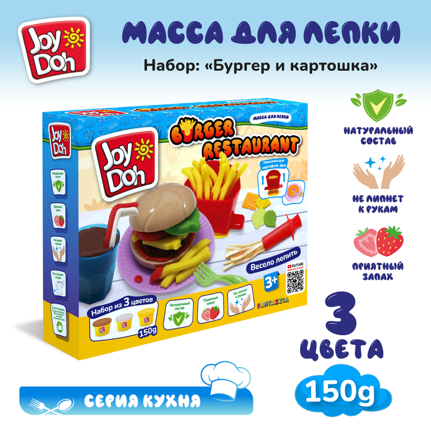 Масса для лепки Joy Doh, набор BURGER RESTAURANT - БУРГЕР И КАРТОШКА, Основа для бургера, 13 аксессуаров, 3 баночки с тестом, (3 х 50г.)