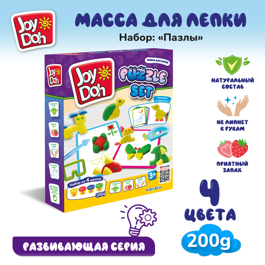 Масса для лепки Joy Doh, набор PUZZLE SET - ПАЗЛЫ, 10 карточек с трафаретам, 13 форм и аксессуаров, 4 баночки с тестом, (4 x 50 г.)