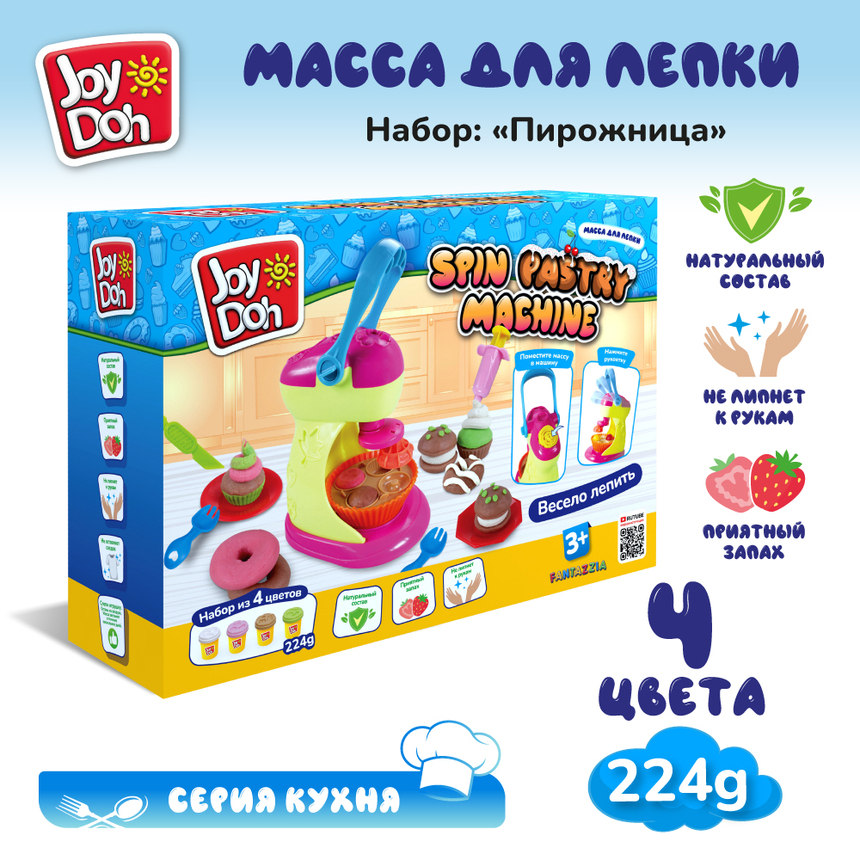 Масса для лепки Joy Doh, набор SPIN PASTRY MACHINE - ПИРОЖНИЦА, фабрика пирожных, 11 аксессуаров, 4 баночки с тестом, (4 x 56 г.)