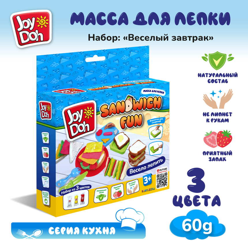 Масса для лепки Joy Doh, набор SANDWICH FUN - ВЕСЕЛЫЙ ЗАВТРАК, пресс-форма для хлеба и ингридиентов, 5 аксессуаров, 3 пакетика с тестом, (3 х 20г.)