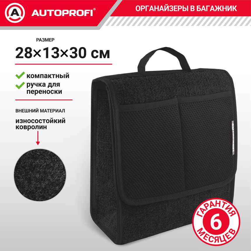 Компактный органайзер-сумка для автомобильного багажника. Сделан из прочного ковролина черного цвета с характерной фактурой. В таком органайзере можно разместить автохимию, инструменты, автоаксессуары. Размер 28х13х30 см. Поместиться в самый маленький багажник!