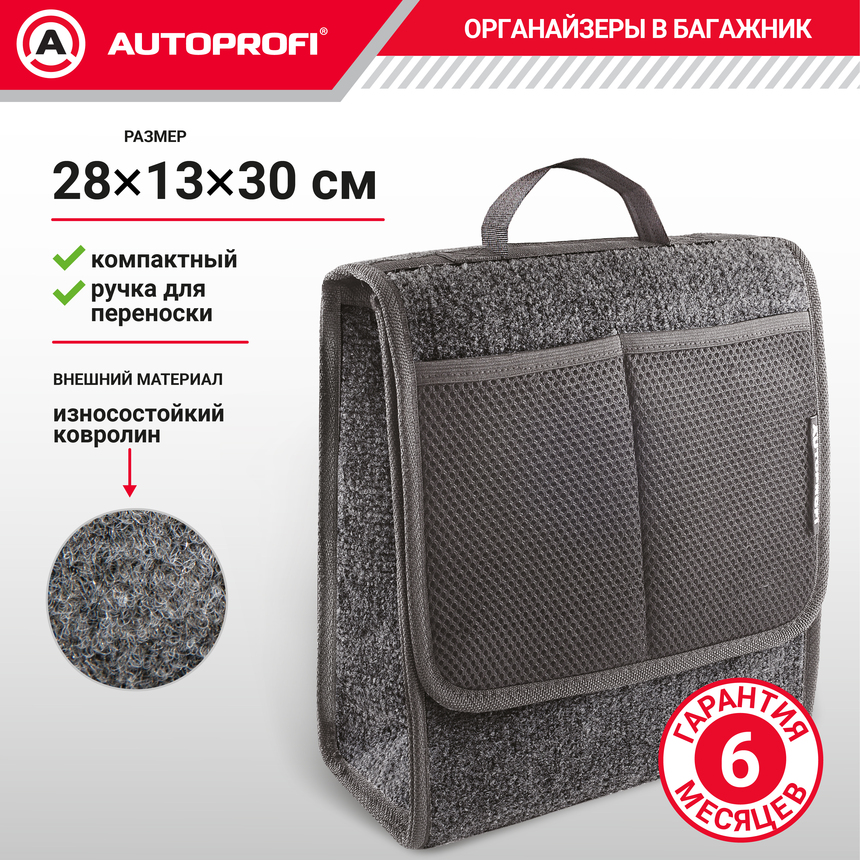 Компактный органайзер-сумка для автомобильного багажника. Сделан из прочного ковролина серого цвета с характерной фактурой. В таком органайзере можно разместить автохимию, инструменты, автоаксессуары. Размер 28х13х30 см. Поместиться в самый маленький багажник!