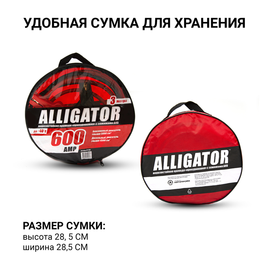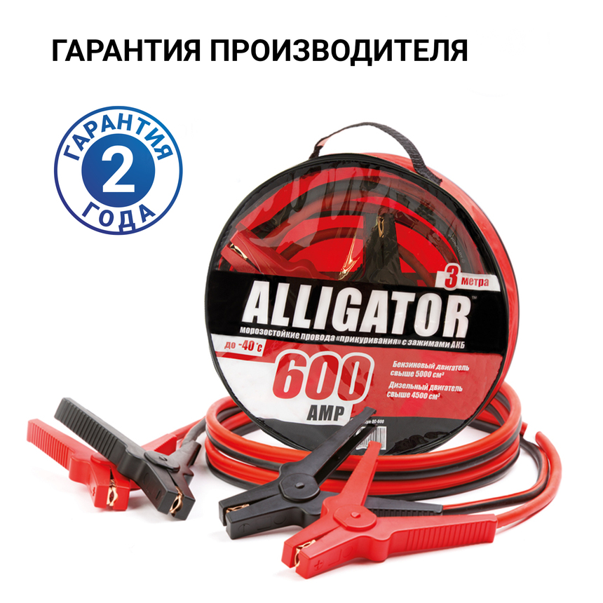 Надёжный и практичный аксессуар – комплект проводов «прикуривания» BC-600 из классической серии «Alligator». Провода обладают длиной 3 метра и пропускают ток силой до 600 ампер. Это позволяет использовать их для запуска большинства автомобилей, в том числе оснащённых бензиновыми двигателями объёмом свыше 6,5 литров или дизельными – объёмом до 3,5 литра.
