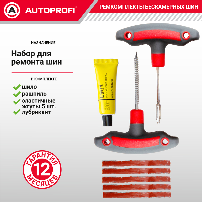 Ремкомплект бескамерных шин "AUTOPROFI", Luxe, (шило-рашпиль, аппликатор жгута, эластичные жгуты, лубрикант)
