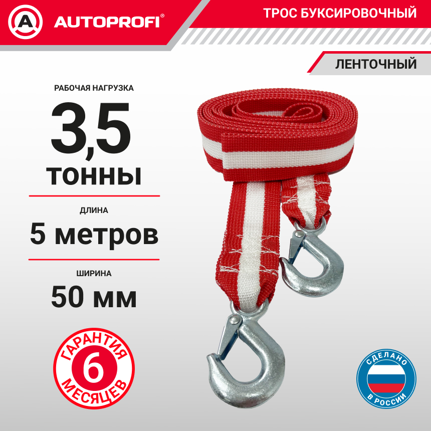 Трос буксировочный лента, AUTOPROFI, 3,5 тонны, с 2-мя крюками, термоупаковка, длина 5 м., ширина 50 мм.