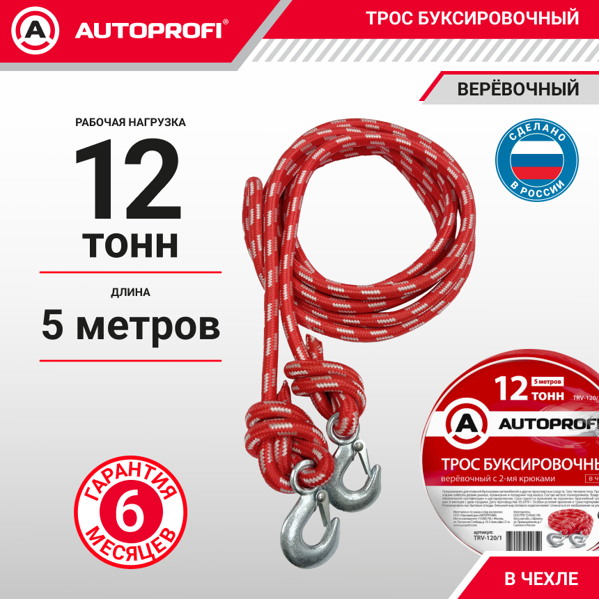 Трос буксировочный веревочный "AUTOPROFI" 12 т, 5 м, 2 крюка, сумка TRV-120/1